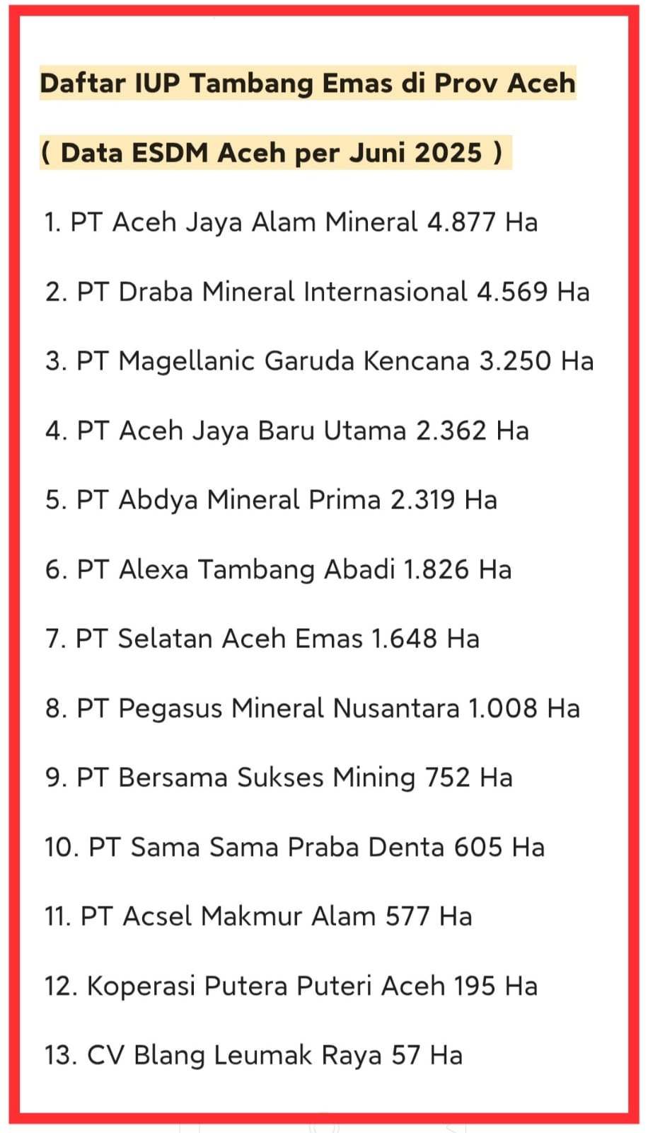 Banda Aceh – Institute for Development of Acehnese Society (IDeAS) mengungkapkan bahwa saat ini terdapat 13 perusahaan pemegang Izin Usaha Pertambangan (IUP) emas di Aceh dengan total luas wilayah mencapai sekitar 24.045 hektare, tersebar di enam kabupaten.